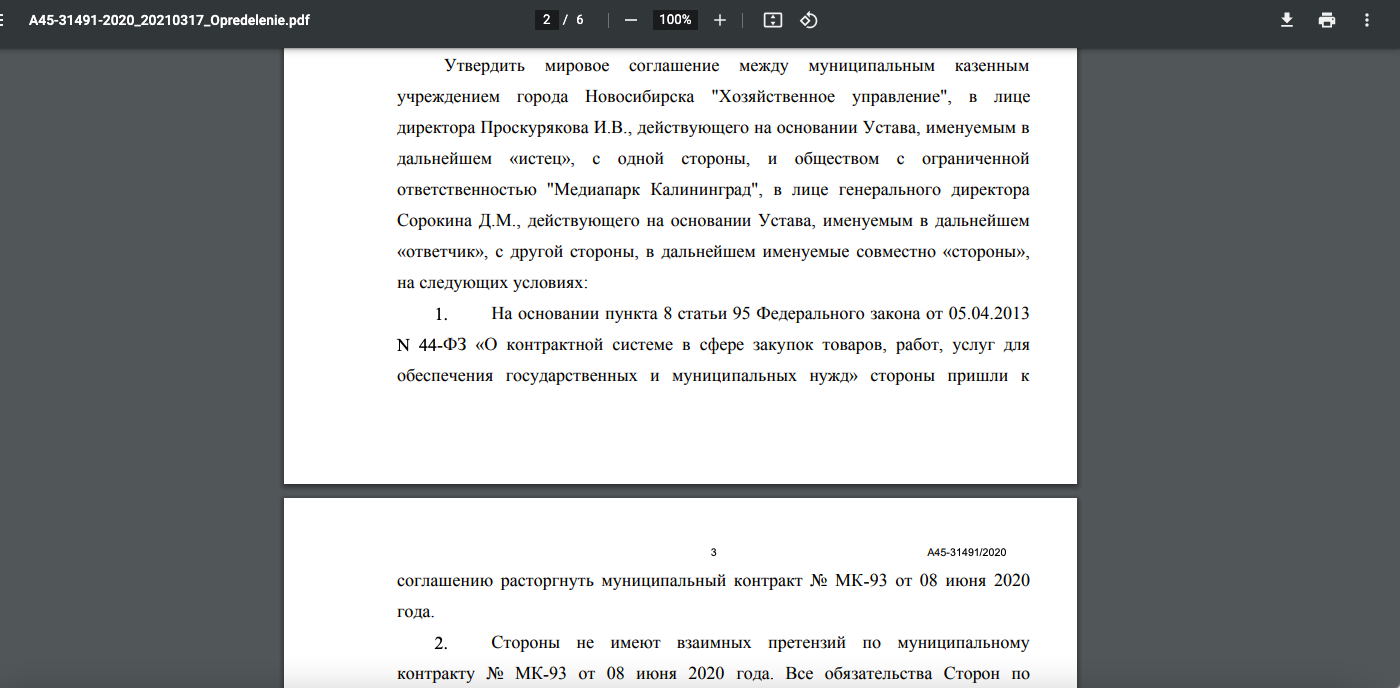 Благодаря работе адвоката Истец согласился с условиями предложенного мирового соглашение и муниципальный контракт был расторгун по соглашению сторон, что исключило попадание поставщика в реестр недобросовестных поставщиков.