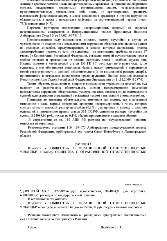 Решением Арбитражного суда города Санкт-Петербурга и Ленинградской области взыскано с ОБЩЕСТВА С ОГРАНИЧЕННОЙ ОТВЕТСТВЕННОСТЬЮ "СЛАНЦЫ" в пользу НАШЕГО КЛИЕНТА 13122909,96 руб. задолженности, 1824084,00 руб. неустойки, 60000,00 руб. расходов по государственной пошлине.