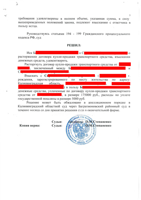 Суд расторг договор купли-продажи транспортного средства с перебитым VIN кузова и взыскал с ответчика все уплаченные за автомобиль денежные средства НАШЕМУ КЛИЕНТУ