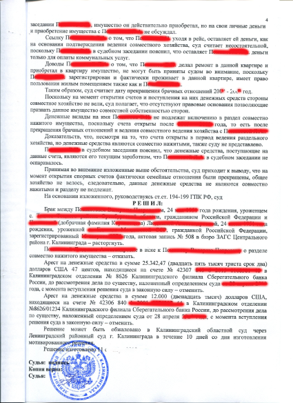 Суд признал, что денежные средства НАШЕГО КЛИЕНТА в сумме 37 342 доллара США, находящиеся на счете в банке, хоть и были получены им в период брака, но не являются совместно нажитым имуществом и отказал истцу в удовлетворении иска